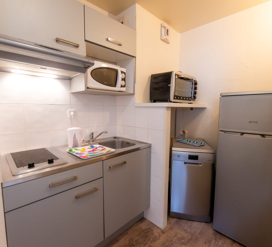Cet appartement dispose d’une entrée, d’une grande pièce à vivre avec couchage 2 personnes, d’une cuisine entièrement équipée en vaisselle et ustensiles et d’une salle de bains.